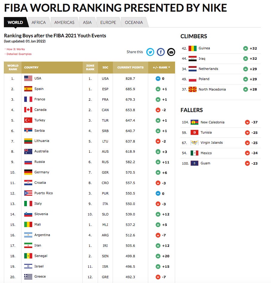 Don’t look now but there is a new system to generate the FIBA world rankings - with the latest edition of the World boys rankings - you can also break down rankings for the different regions as well (Africa, Americas, Asia, Europe and Oceania) - seeing a couple of moves near the top. It’s no surprise that United States are the undisputed number one in the world. But Spain and France both jumped up one spot to second and third, respectively, with Canada falling two spots to fourth. A big reason for that fall was Canada losing to Argentina in the Group Phase of the FIBA U16 Americas Championship 2021 and then to the United States in the Semi-Finals before taking the bronze medal.