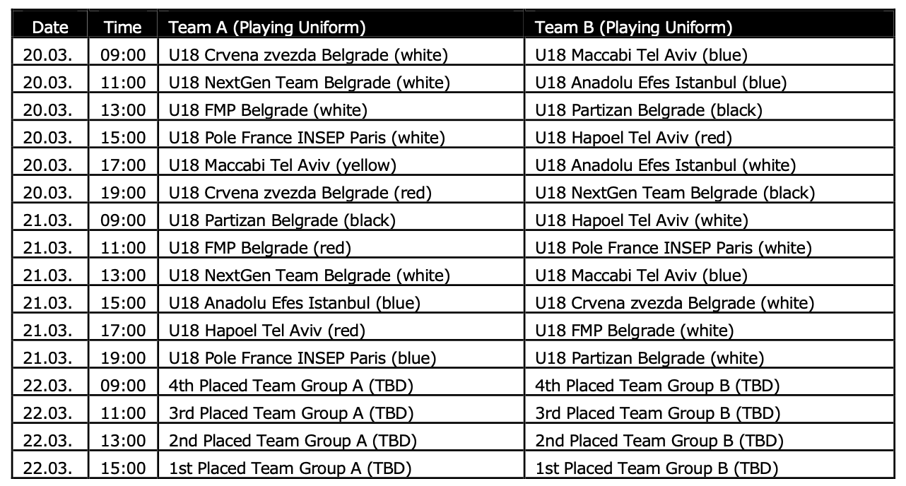 Eight teams will fight it out at the Aleksandar Nikolic Hall with the first place finisher gaining a spot at the Adidas NextGen Finals at the EuroLeague Final Four in Athens in May. The winner will join Cedevita Olimpija Ljubljana and FC Barcelona in Greece after the Slovenian and Spanish clubs claimed the crowns at the NextGen Ulm and NextGen Bologna tournaments, respectively.