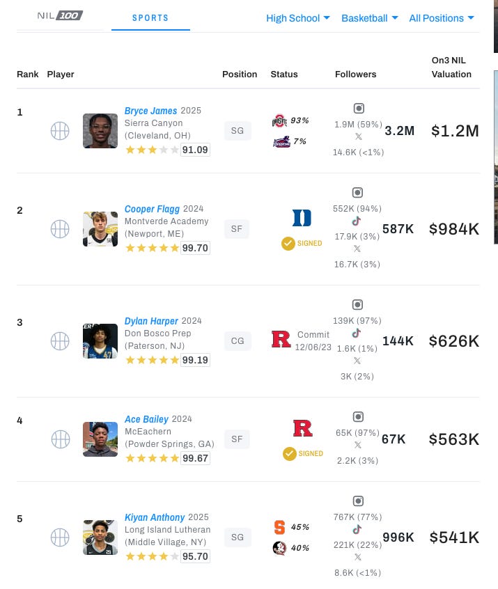 And even high schoolers can earn big NIL money. On3 estimates the value of LeBron James’ other son Bryce James at $1.2 million dollars while Cooper Flagg - expected to be the No. 1 pick in the 2025 NBA Draft - is valued at $984,000. On3 estimates 35 high school basketball players are valued with at least $200,000.