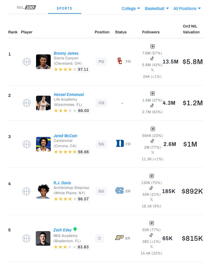 Topping the list is Bronny James, who On3 estimates with a $5.8 million valuation. Hansel Enmanuel, most well-known for his talent despite having just one arm, is valued at $1.2 million while Duke freshman Jared McCain is valued at $1.0 million.
