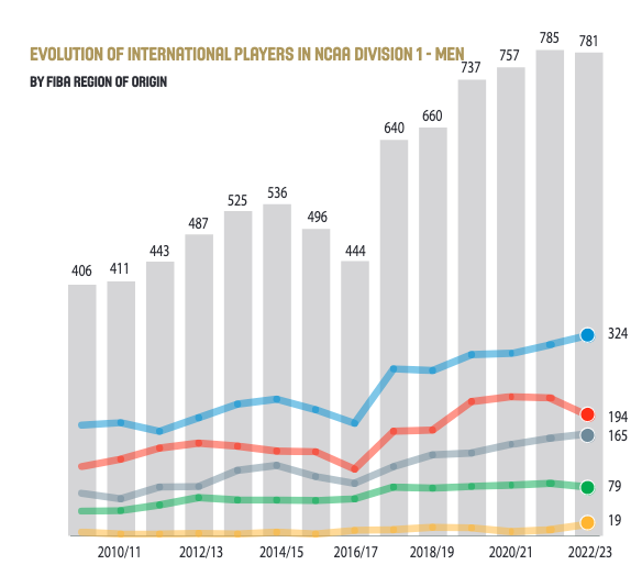 FIBA publishes an annual International Basketball Migration Report, and findings from the Switzerland-based International Centre for Sports Studies (CIES) showed that 781 international male players played for Division I schools in 2022-23. A total of 324 Europeans decided to go the college route - a number which has increased drastically from 182 in 2016-17 and rose from 309 in 2021-22.